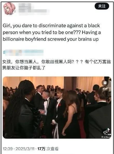 外网网友晒出Lisa红毯无视黑人记者采访的画面,斥责她想当黑人竟然还敢歧视黑人,吐槽她拥有一个亿万富翁男友就把她脑子搞坏了。这段切片画面外网传播率很高,短时间内就几十万播放量,点赞转发也大几千。